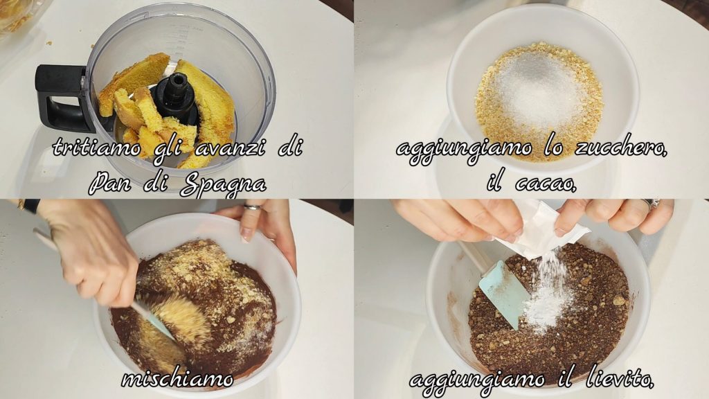Primeiro, trituramos as sobras de Pão de Ló, adicionamos o açúcar, o cacau e misturamos.