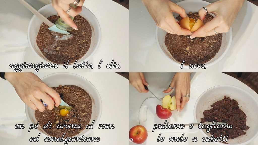 Adicionamos o fermento, o leite, o óleo, o ovo, um pouco de aroma de rum e misturamos. Limpamos e cortamos as maçãs em cubos.