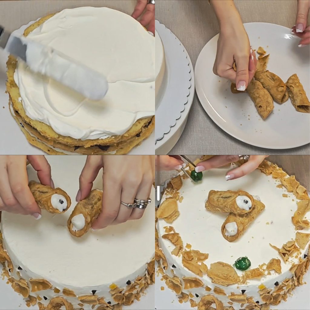 Cubra todo o bolo com chantilly, esmague algumas cascas de cannoli vazias e decore o bolo. Podemos adicionar também gotas de chocolate e frutas cristalizadas a gosto.