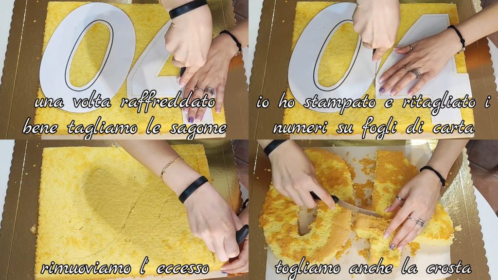 Depois de assado e frio, cortamos o Pão de Ló nas formas desejadas (eu imprimi os números em um papel e depois recortei). Removemos o excesso e a crosta.
