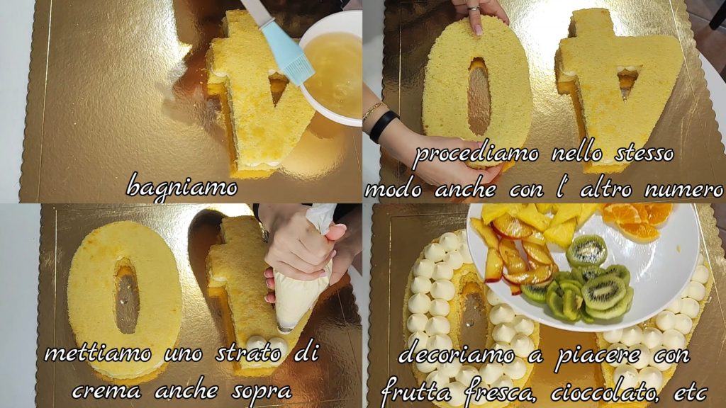 Cortamos os números em duas partes iguais. Colocamos a primeira parte e umedecemos com água, açúcar e aromas a gosto. Adicionamos uma camada de creme usando um saco de confeitar.