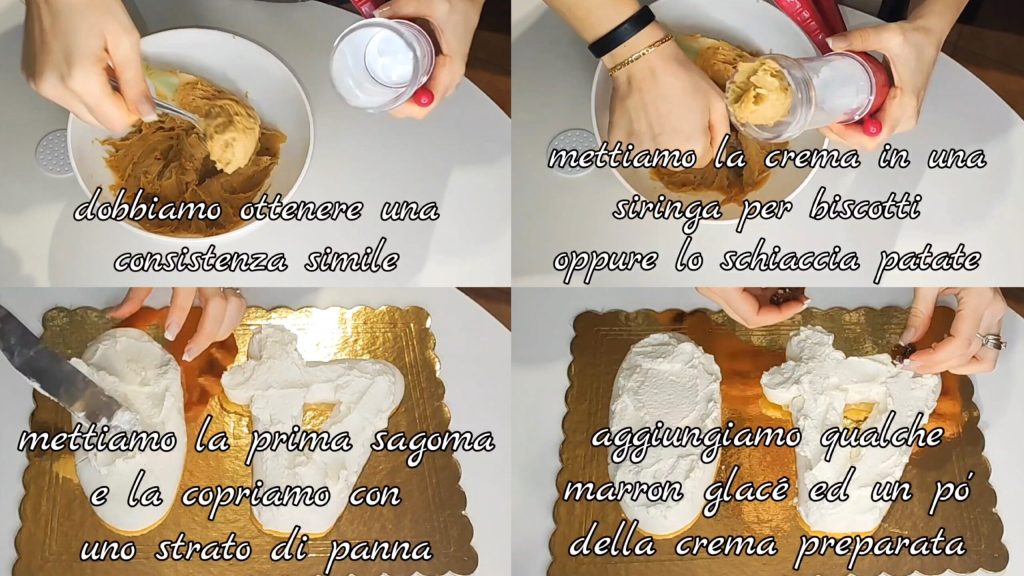 Colocamos a primeira forma de merengues, cobrimos com uma camada de chantilly. Adicionamos alguns marrons glacés e um pouco do creme preparado.