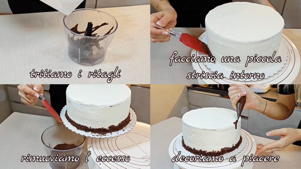 Trituramos as sobras dos discos e fazemos uma pequena faixa na borda do bolo. Removemos o excesso com a espátula. Decoramos a gosto com ganache de chocolate, etc.