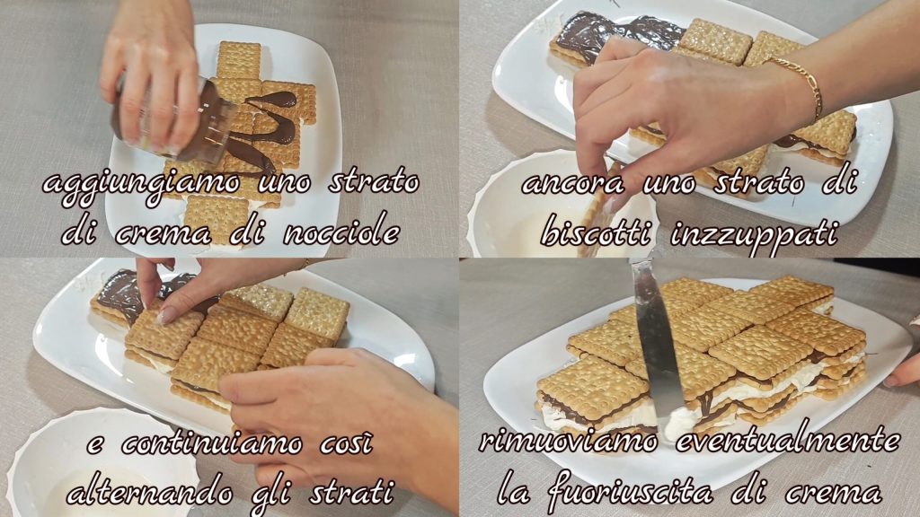 Adicionamos por cima uma camada de creme de avelã, mais uma camada de biscoitos molhados e continuamos assim alternando as camadas. Removemos eventualmente o excesso de creme.