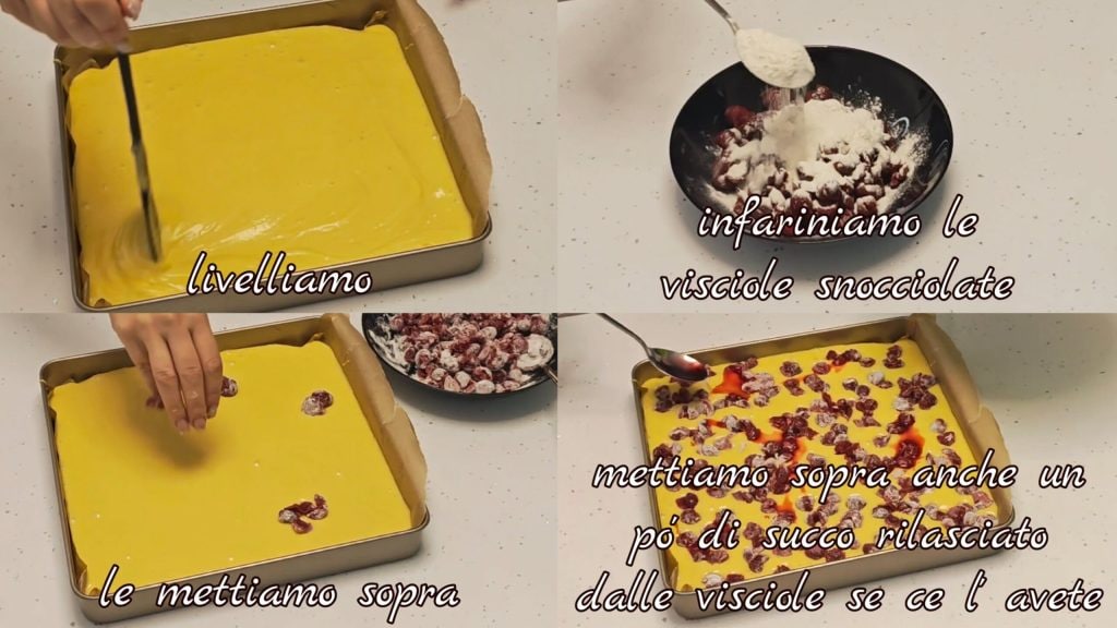 • alise com uma espátula. Enfarinhe as cerejas ácidas sem caroço e coloque por cima. Adicione também um pouco da calda liberada pelas cerejas (se houver)