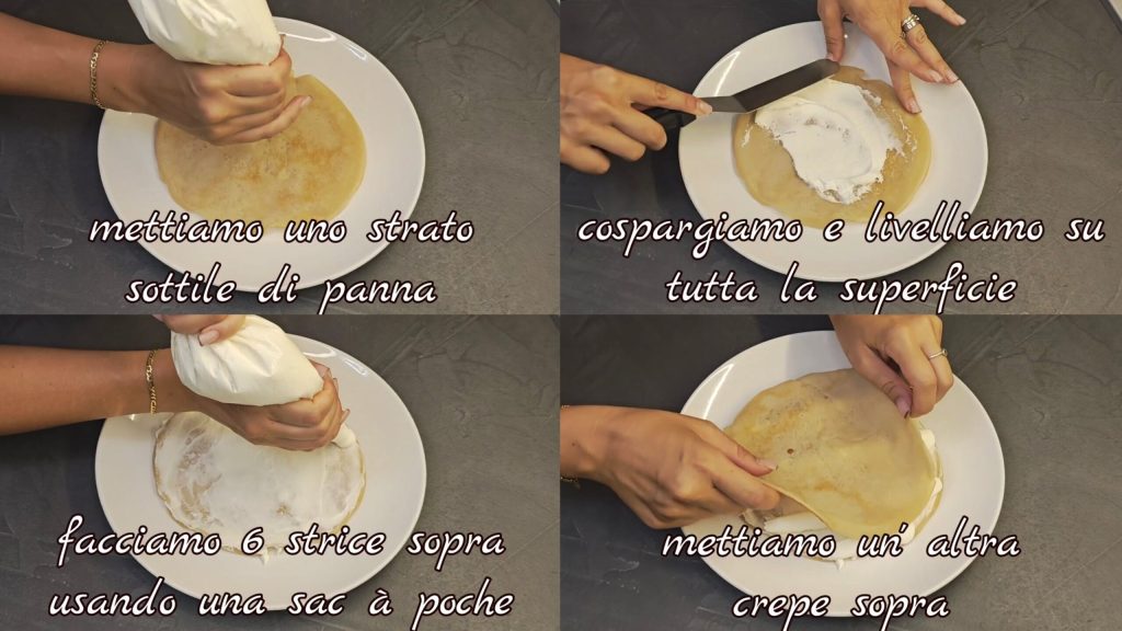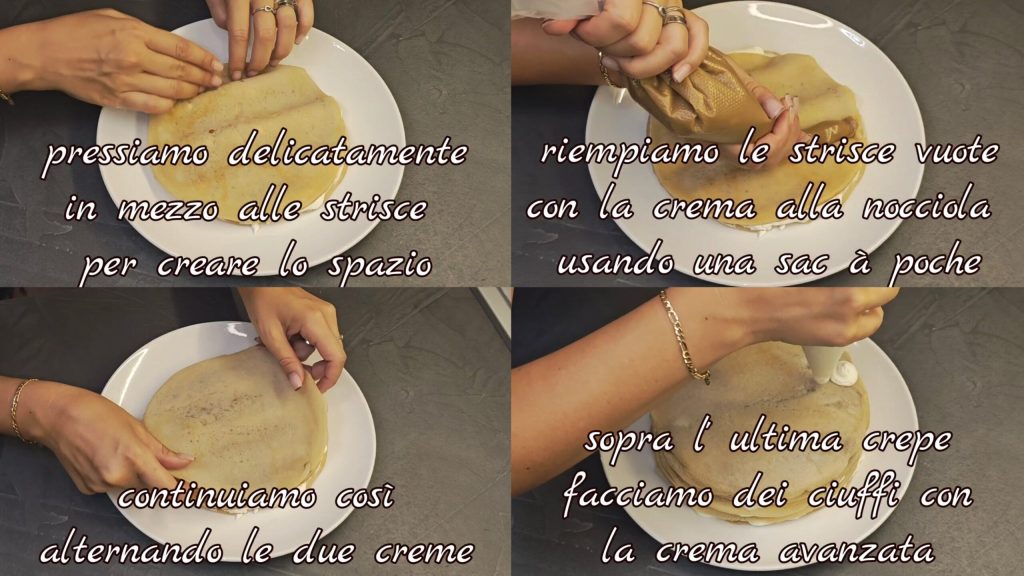 • pressionamos levemente entre as listras para criar espaço. Preenchemos as listras vazias com o creme de avelã usando um saco de confeitar. Continuamos assim alternando os dois cremes. Sobre o último crepe fazemos pequenas rosetas com o creme restante.