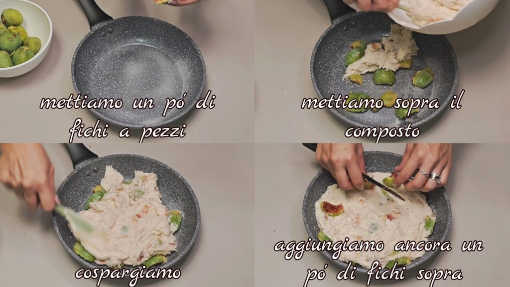 Adicione o fermento e misture bem. Lave e limpe os figos e depois adicione alguns pedaços de figo à massa. Misture delicadamente. Pegue uma frigideira (20 cm) e unte um pouco.