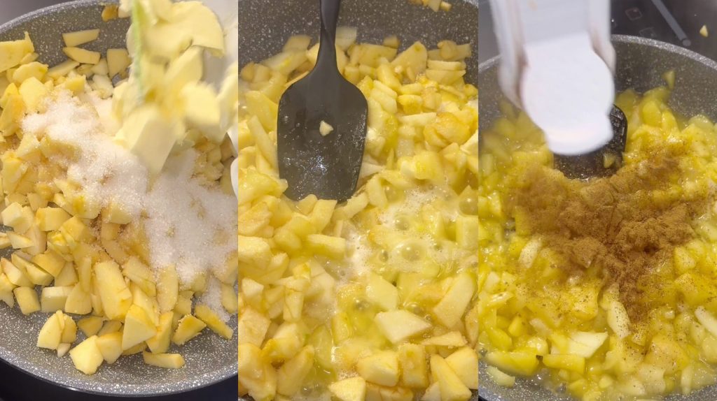 Descasque e corte as maçãs em cubos. Coloque na panela as maçãs, o açúcar e a margarina. Cozinhe por cerca de 10 minutos, até que fiquem macias mas não desmanchem. Adicione a canela, misture e deixe esfriar completamente.