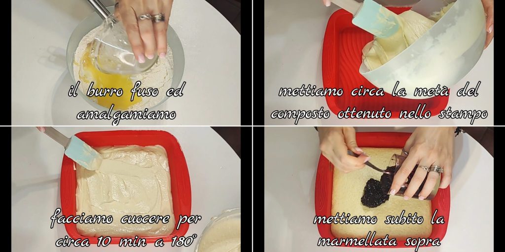 Adicionamos a manteiga derretida e misturamos. Colocamos cerca de metade da massa obtida na forma, nivelamos e assamos por cerca de 10 minutos a 180ºC. Retiramos do forno e imediatamente colocamos a geleia por cima, espalhando bem.
