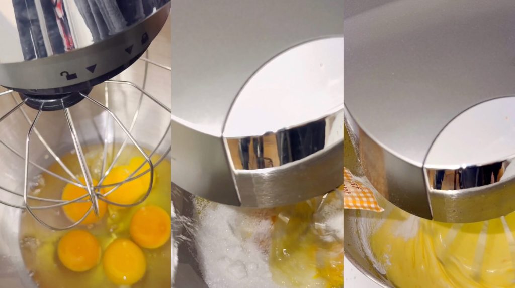 Bata os ovos com o açúcar até obter uma mistura clara, fofa e cremosa.