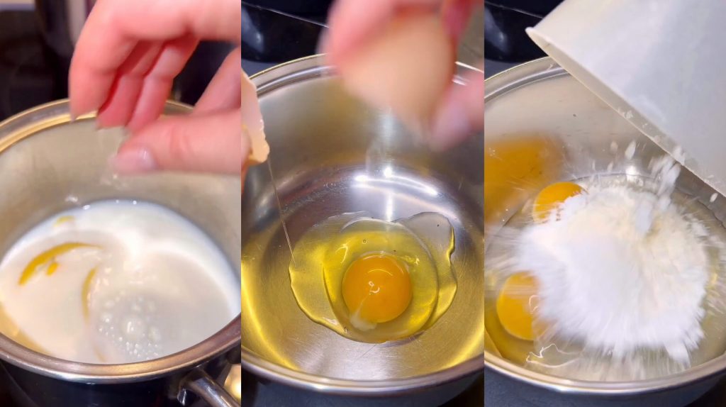 Em uma panela pequena misture os ovos, o açúcar, o amido e mexa.