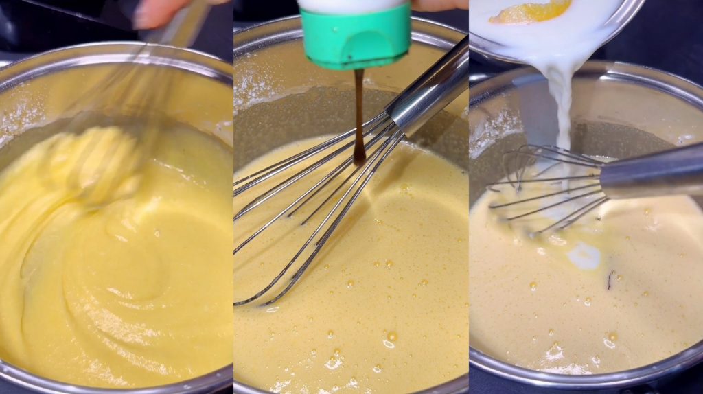 Acrescente a baunilha e despeje o leite quente. Leve ao fogo mexendo constantemente até que o creme engrosse.