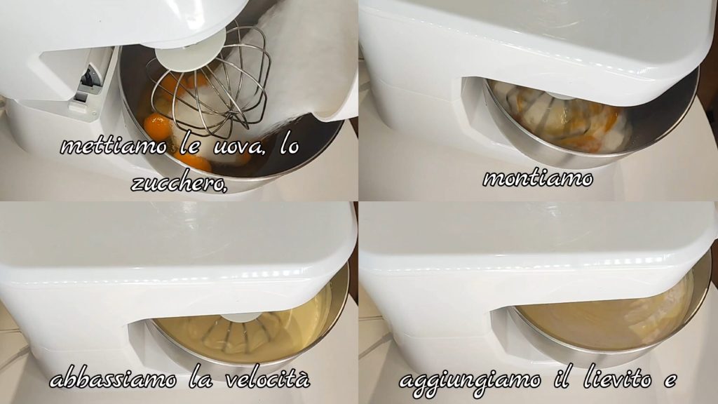 Colocamos os ovos, o açúcar e batemos até obter uma mistura clara e cremosa. Reduzimos a velocidade da batedeira e adicionamos o fermento.