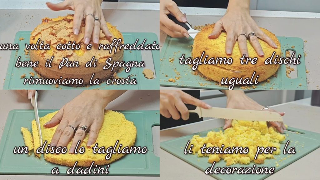 Uma vez que o Pão de Ló esteja assado e bem frio, retire a crosta de toda a superfície e corte em três discos iguais. Um disco corte em cubos e reserve.