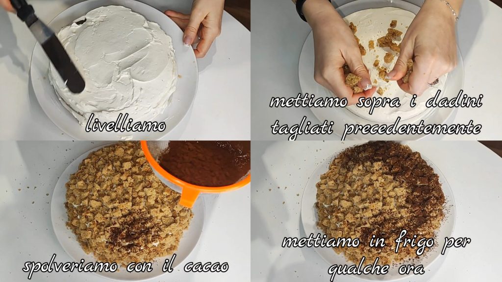 Nivelamos e adicionamos os cubinhos cortados anteriormente. Polvilhamos com cacau e decoramos a gosto.