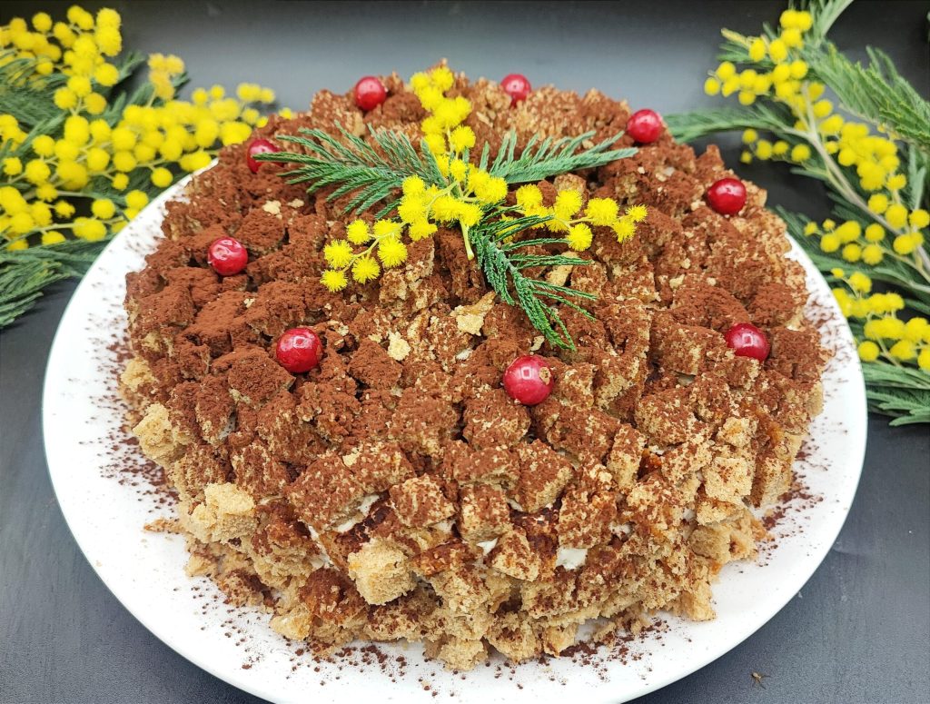 Um bolo feito sem ovos, com a adição de café na base e depois embebido novamente com café açucarado e recheado com um creme macio de chantilly e mascarpone e, obviamente, a decoração típica do mimosa, ou seja, coberto com todos os cubinhos! Definitivamente é uma das melhores mimosas sem ovos que eu já fiz. ☺️ Se você gosta dos bolos mimosa, experimente também estas receitas: Bolo mimosa clássico, Bolo mimosa espiral com frutas vermelhas, Zuccotto mimosa de chocolate, Rolo mimosa, etc.