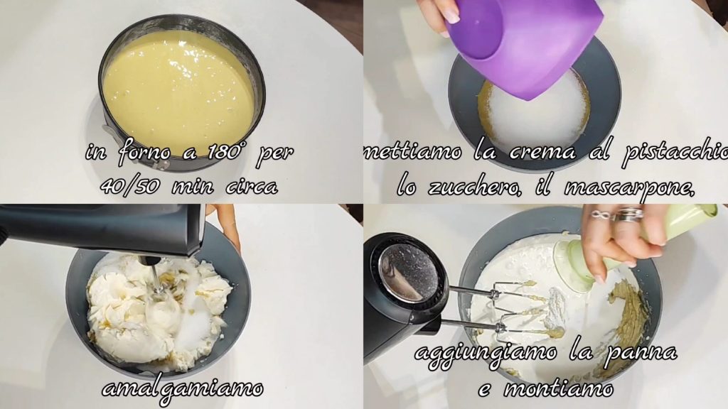 Em um recipiente, colocamos o creme de pistache, o açúcar, o mascarpone e misturamos. Adicionamos a nata e batemos com as batedeiras.