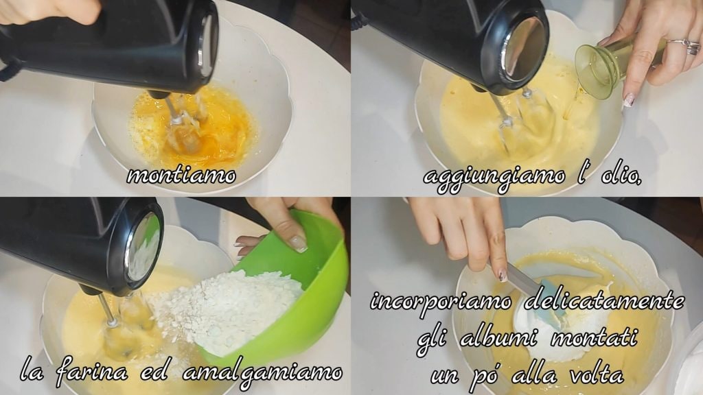 Bata até obter uma mistura cremosa. Adicione o óleo. Acrescente a farinha aos poucos e misture bem. Incorpore as claras em neve aos poucos com movimentos delicados de baixo para cima.