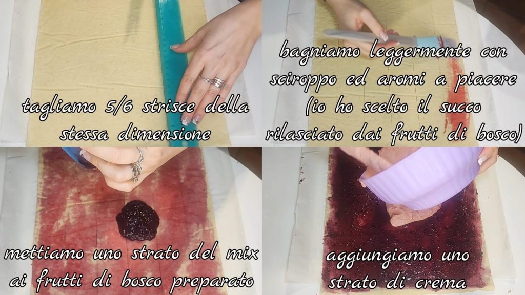 Corte 5/6 tiras do mesmo tamanho. Molhe levemente com calda e aromas a gosto (eu escolhi o suco liberado pelas frutas vermelhas). Coloque uma camada do mix de frutas vermelhas preparado (a metade restante) e espalhe por toda a superfície. Adicione uma camada de creme por cima.