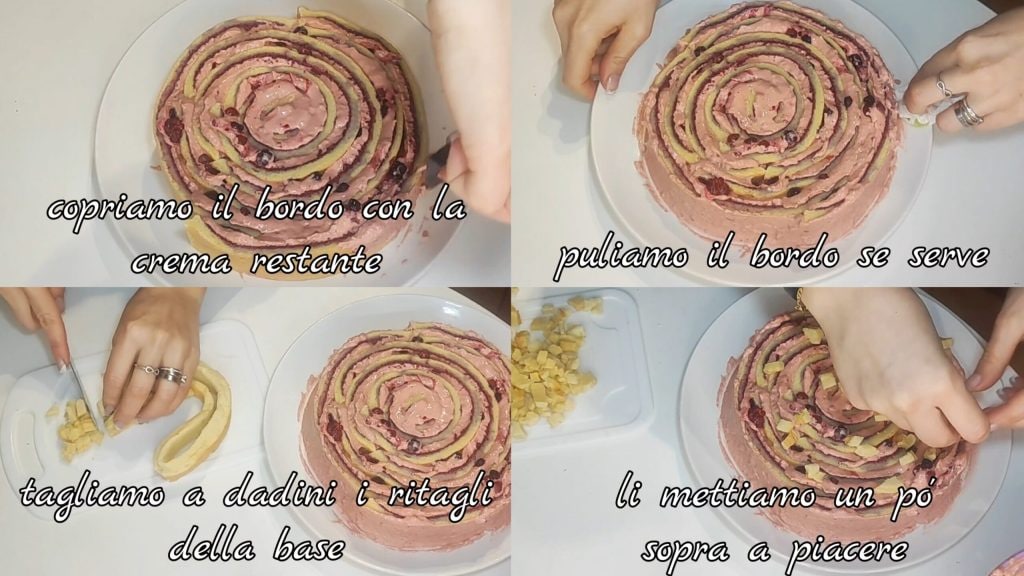 Cubra a borda com o creme restante. Corte em cubos os pedaços da base e coloque por cima a gosto.