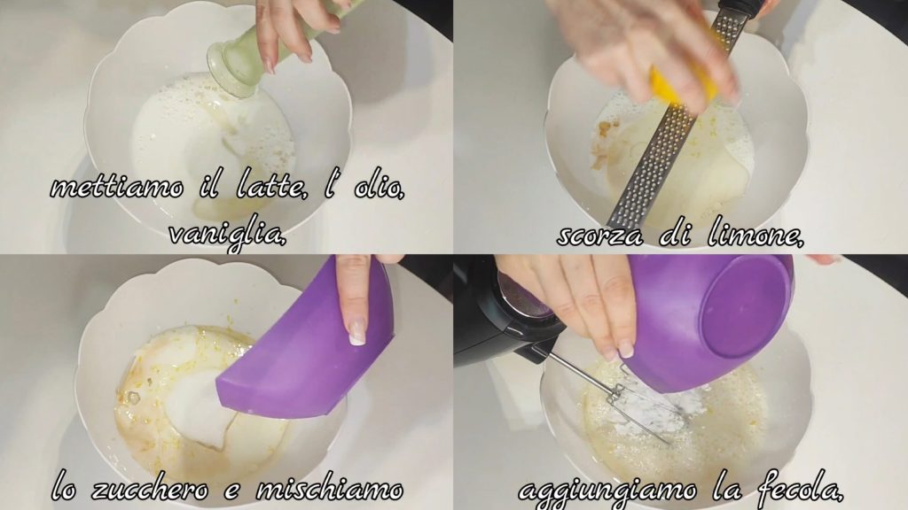 Em um recipiente colocamos o leite, o óleo, baunilha, raspas de limão, açúcar e misturamos. Adicionamos a fécula.