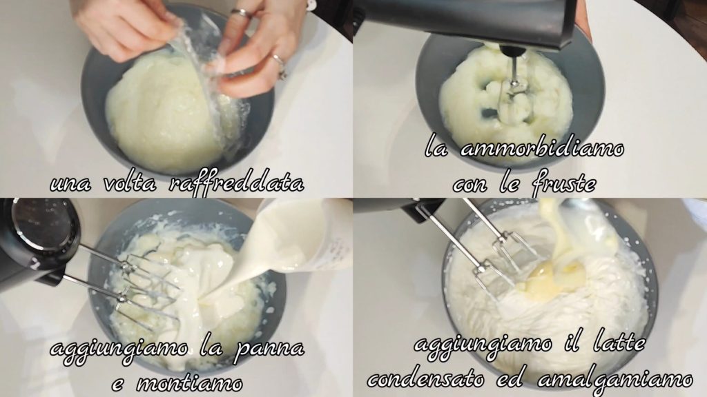 Uma vez fria, amolecemos com as batedeiras, adicionamos o creme de leite e batemos. Colocamos o leite condensado e misturamos bem.