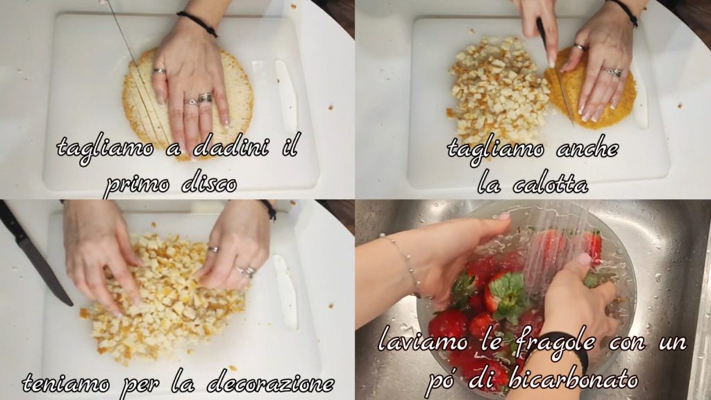 Cortamos em cubinhos o primeiro disco, cortamos também a tampa e reservamos para a decoração.