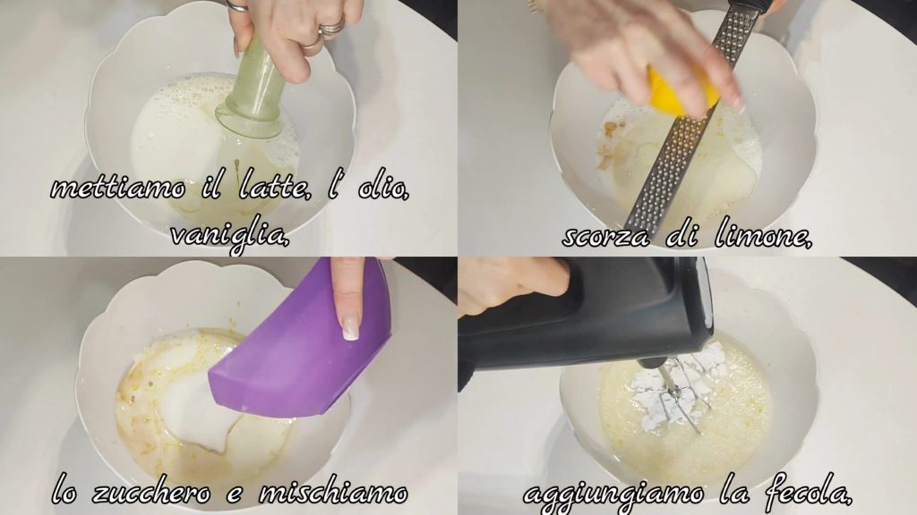 Em um recipiente, colocamos o leite, o óleo, a baunilha, um pouco de raspas de limão, o açúcar e misturamos. Adicionamos a fécula.