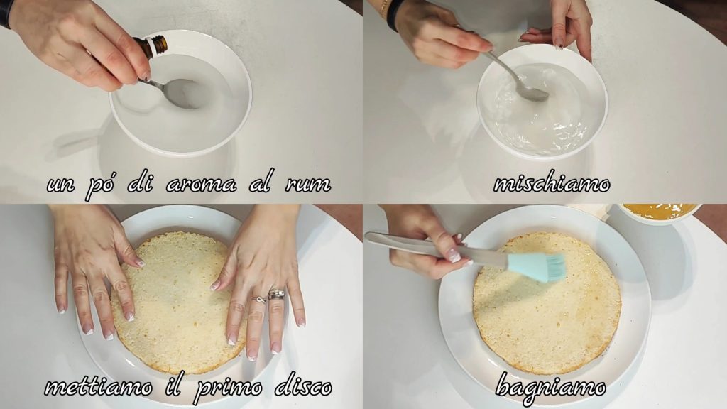 Adicionamos um pouco de aroma de rum ou outros aromas a gosto e misturamos. Colocamos o primeiro disco de Pan di Spagna, umedecemos.