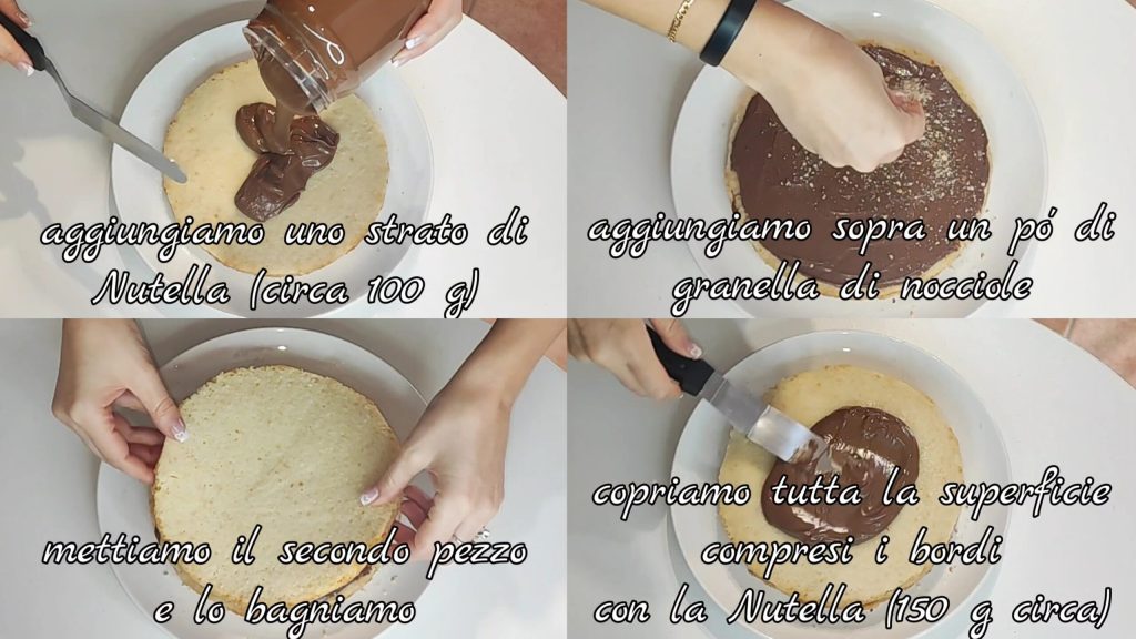 Adicionamos uma camada de Nutella (cerca de 100 g) e um pouco de granulado de avelã. Colocamos o segundo disco de Pan di Spagna, umedecemos, depois cobrimos toda a superfície com Nutella (cerca de 150 g), incluindo as bordas.