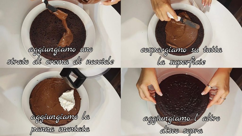 Adicione o creme de avelã. Espalhe por toda a superfície. Adicione o chantilly e cubra com o outro disco.