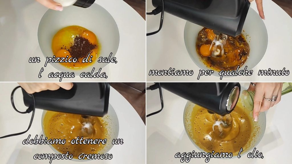 Adicionamos a água quente e batemos por alguns minutos, até obter uma mistura cremosa. Adicionamos o óleo.