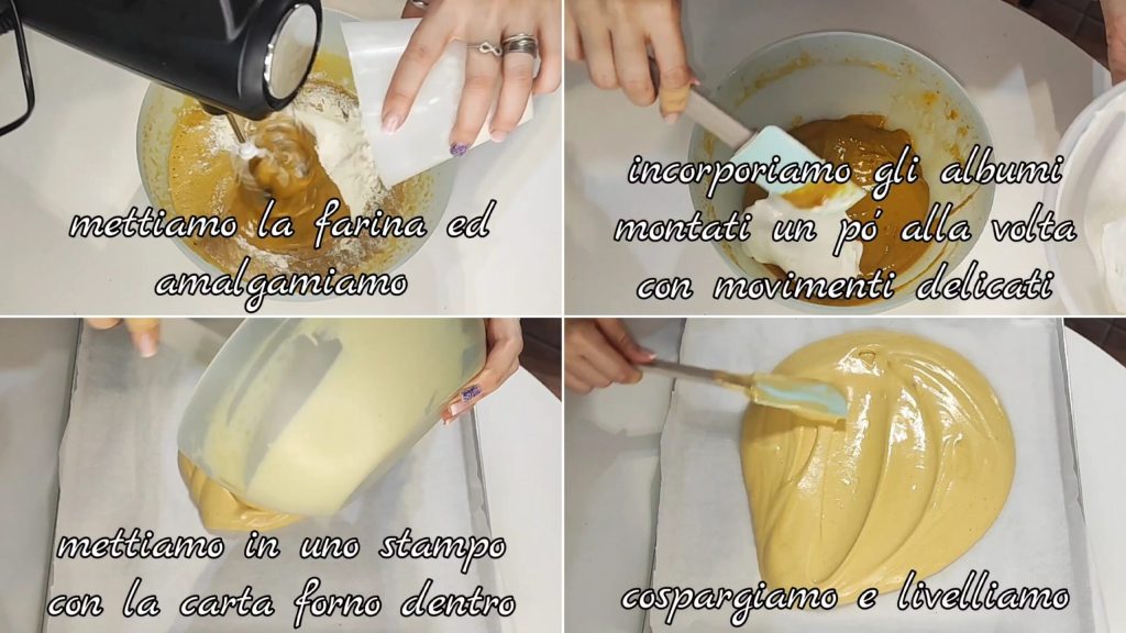 Adicionamos a farinha e misturamos bem. Incorporamos as claras em neve aos poucos, com movimentos delicados de baixo para cima. Colocamos a mistura obtida em uma forma (35×35 cm) com papel manteiga dentro. Espalhamos e nivelamos.