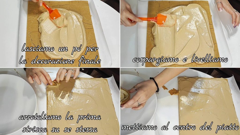 (Deixamos algumas colheres para decoração). Espalhamos por toda a superfície e nivelamos. Enrolamos a primeira tira sobre si mesma e colocamos no centro do prato.
