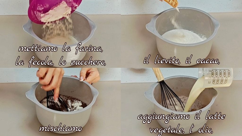 Em um recipiente coloque a farinha, a fécula, o açúcar, o fermento, o cacau e misture. Adicione o leite vegetal, o óleo,