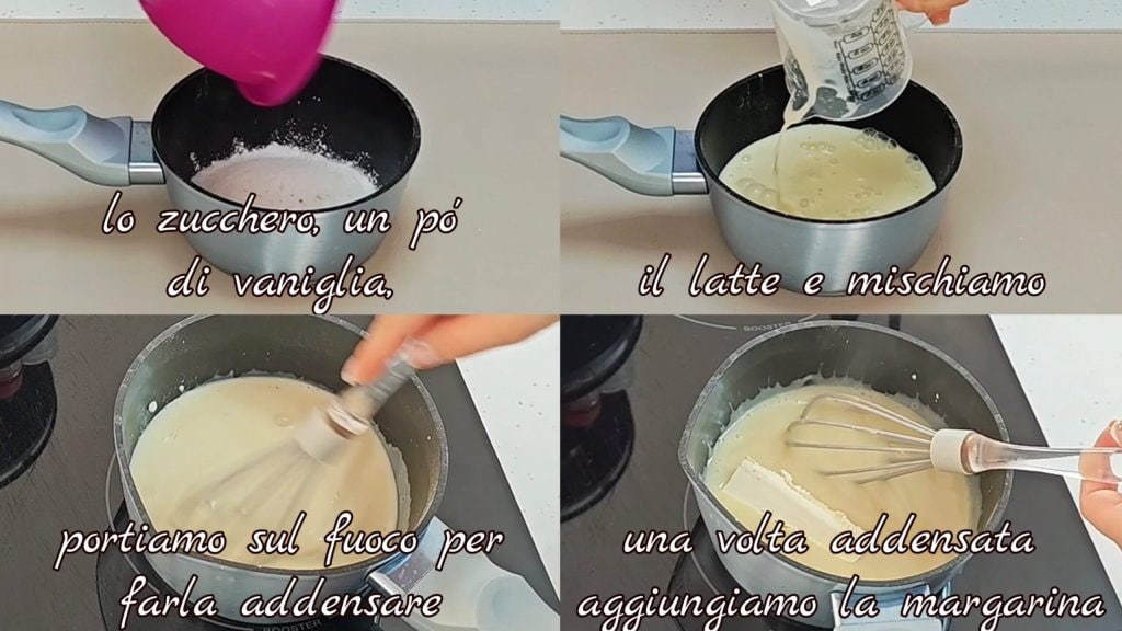 Adicione o açúcar, um pouco de baunilha, o leite e misture. Leve ao fogo para engrossar, mexendo sempre. Uma vez engrossado, desligue e adicione a margarina