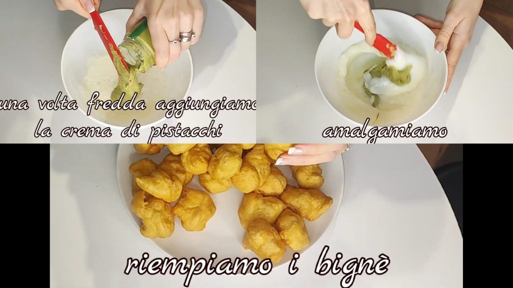 Uma vez frio, adicionamos o creme de pistache e misturamos. Recheamos as bombas usando um saco de confeitar.