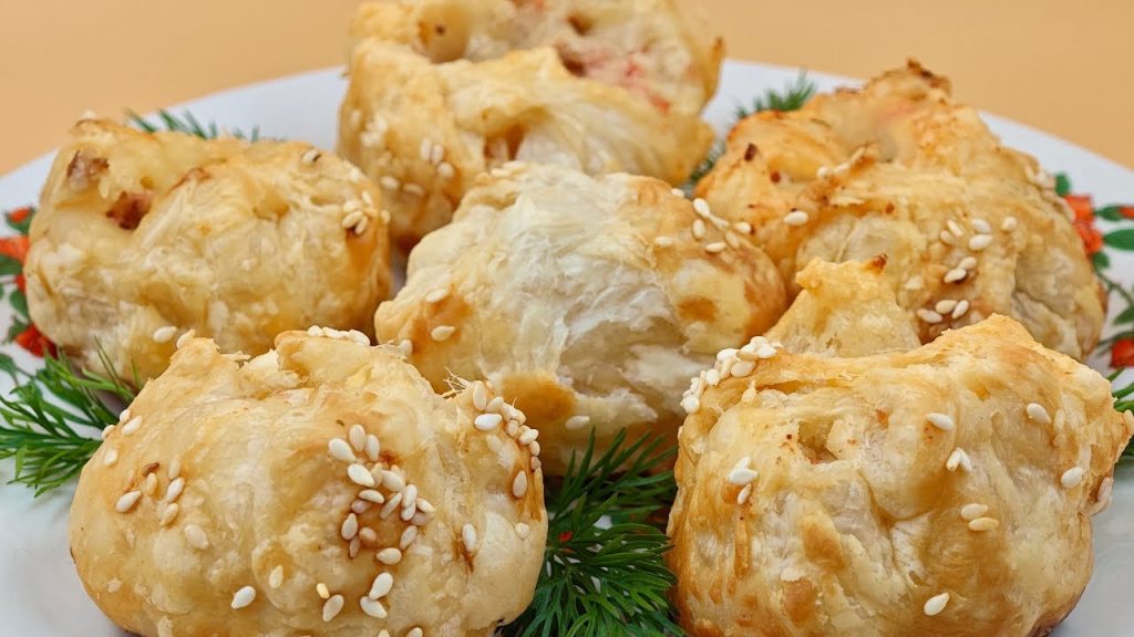• acrescentamos sementes de gergelim por cima. Asse em forno pré-aquecido a 180°C por cerca de 15-20 minutos, ou até que a massa folhada esteja dourada e crocante.