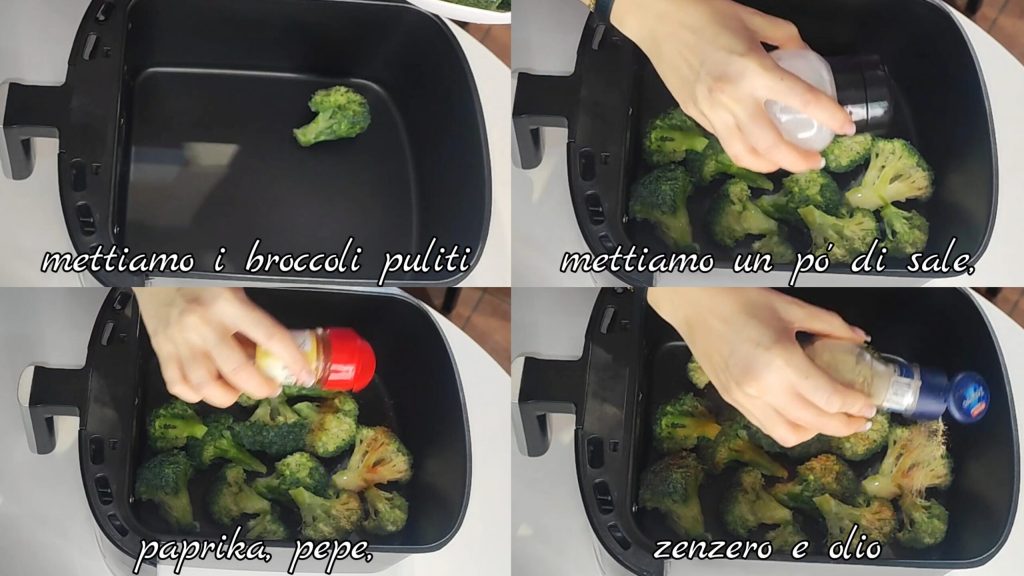 • Primeiro, precisamos limpar e lavar os brócolis, deixamos escorrer e depois colocamos no cesto da fritadeira elétrica. Colocamos um pouco de sal e especiarias a gosto (páprica, pimenta, gengibre, etc). Borrifamos um pouco de azeite de oliva extravirgem por cima.