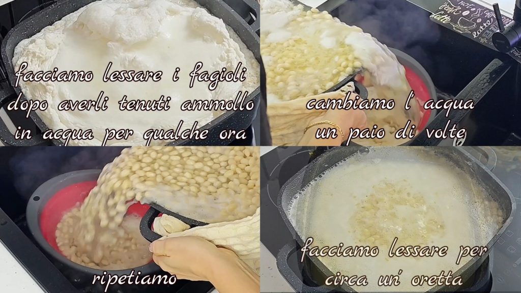 Comecei a preparação na noite anterior deixando os feijões de molho em água fria, exatamente como minha avó fazia. Se você esquecer de fazer isso na noite anterior, pode fazer no mesmo dia, deixando-os de molho por algumas horas. Eu os cozinhei trocando a água algumas vezes.