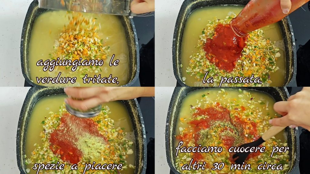 Após cerca de uma hora, no meu caso, adicionei os vegetais picados, o purê de tomate e especiarias a gosto e continuei a cozinhar por mais 30 minutos aproximadamente.
