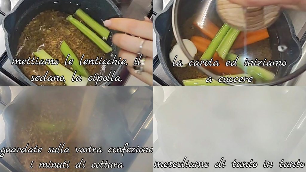 Em uma panela, colocamos as lentilhas, a água, o aipo, a cebola, a cenoura e começamos a cozinhar. Mexemos de vez em quando.