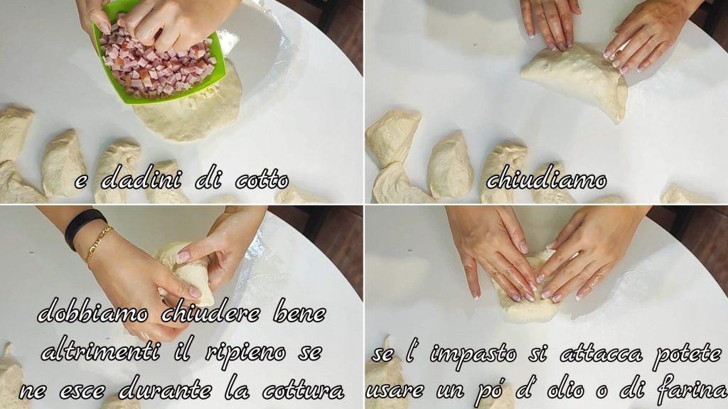Adicionamos cubos de presunto e fechamos bem para evitar que o recheio saia durante o cozimento. Continuamos assim até esgotar os ingredientes.