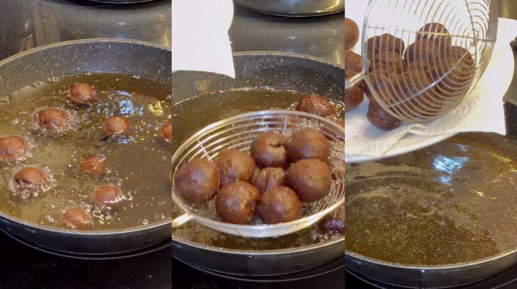 • Deixamos cozinhar por alguns minutos, girando frequentemente, até estarem cozidas. Escorremos em papel absorvente. Quando ainda estiverem mornas, polvilhamos com bastante açúcar de confeiteiro.