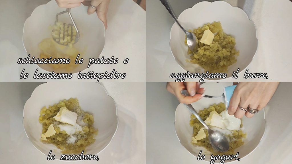 Primeiro temos que limpar, lavar e cozinhar as batatas, escorremos bem, depois esmagamos e deixamos esfriar. Uma vez frias, adicionamos a manteiga, o açúcar, o iogurte.