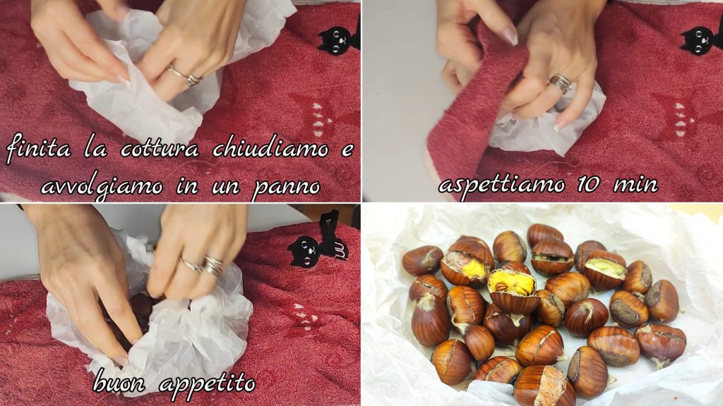 Após o cozimento, feche-as imediatamente no papel manteiga e envolva em um pano, espere cerca de 10 min. Este passo facilitará a abertura das castanhas.