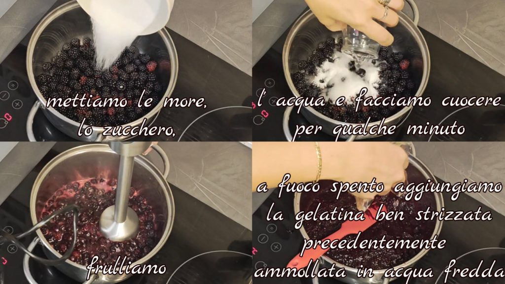 Em uma panela, colocamos as amoras, o açúcar, a água e deixamos cozinhar por alguns minutos, em seguida, batemos a mistura com um mixer de imersão. Com o fogo desligado, adicionamos a gelatina previamente hidratada e misturamos.