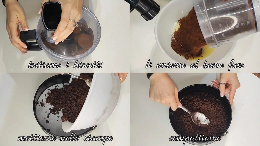 Triture os biscoitos usando um liquidificador e depois misture com a manteiga derretida. Misture bem e coloque a mistura em uma forma de fundo removível forrada com papel manteiga. Compacte bem