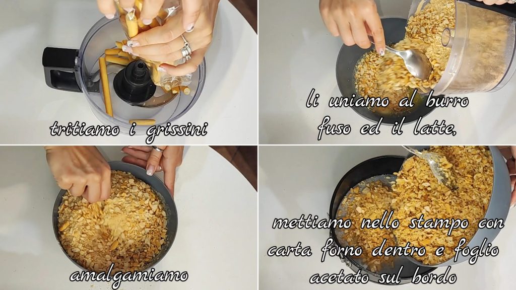 Primeiro trituramos os grissini e os misturamos com a manteiga derretida e o leite. Misturamos bem. Colocamos na forma com papel manteiga dentro e, se necessário, uma folha de acetato nas bordas.