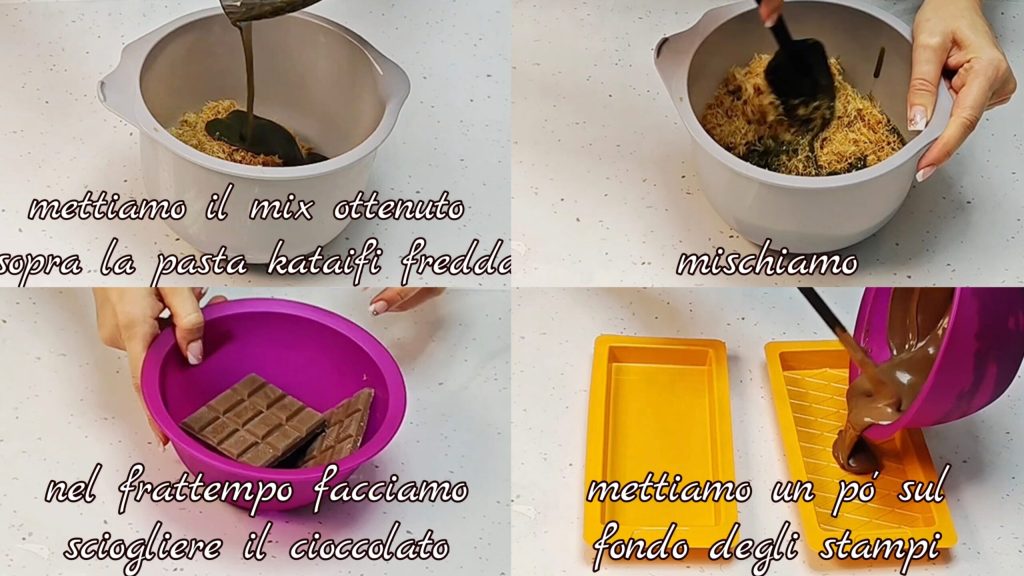 Adicionamos a mistura obtida sobre a massa kataifi fria e misturamos bem. Enquanto isso, derretemos o chocolate (eu derreti a metade) e colocamos um pouco no fundo das formas